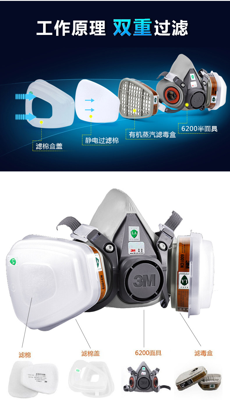 3M 防毒口罩 6200+6001套装 防毒面具 喷漆焊接防尘工业粉尘化工农药活性炭面罩6200+6004七件套