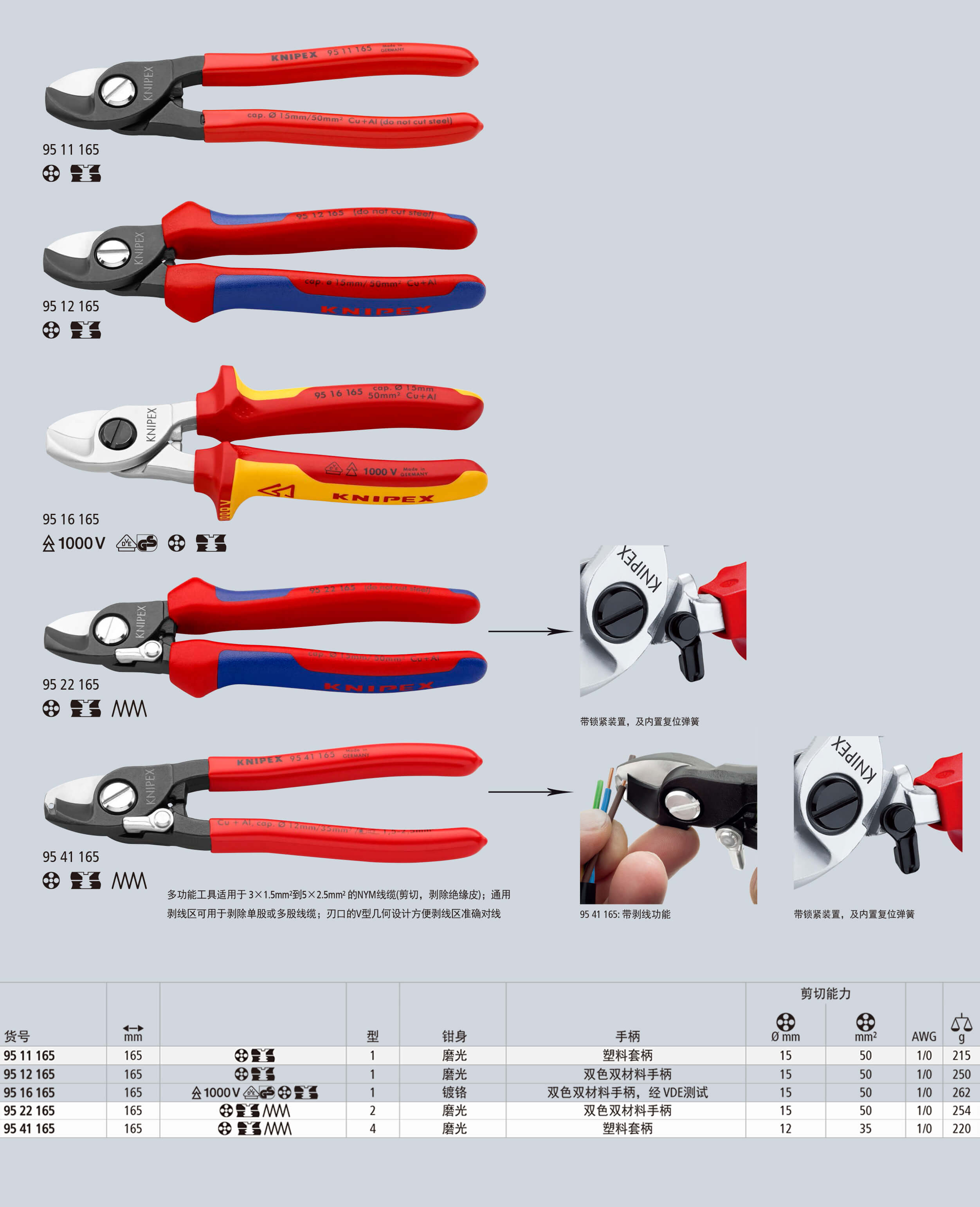 凯尼派克(KNIPEX)95 12 165 电工电缆剪(磨光头,双色双重材料手柄)