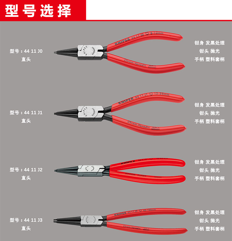凯尼派克(KNIPEX)44 11 J0 内卡簧钳 8-13mm 抛光 塑料套柄 直头 切割类工具 钢