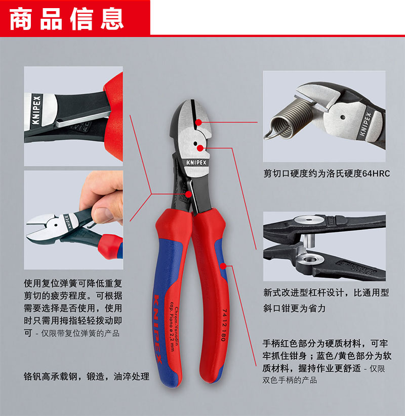 凯尼派克(KNIPEX)74 02 180 省力型斜口钳 抛光 双色手柄 180mm 切割类工具 钢