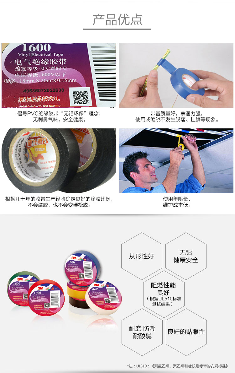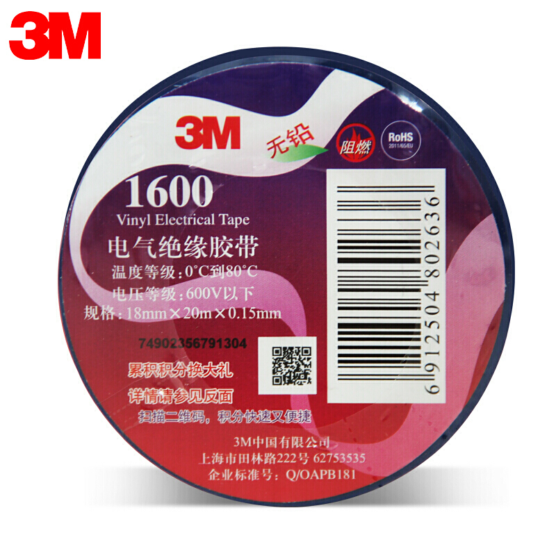 3M 1600# 无铅电气(电工)绝缘胶带 汽修家装 耐磨防潮耐酸碱18mm*20m蓝色