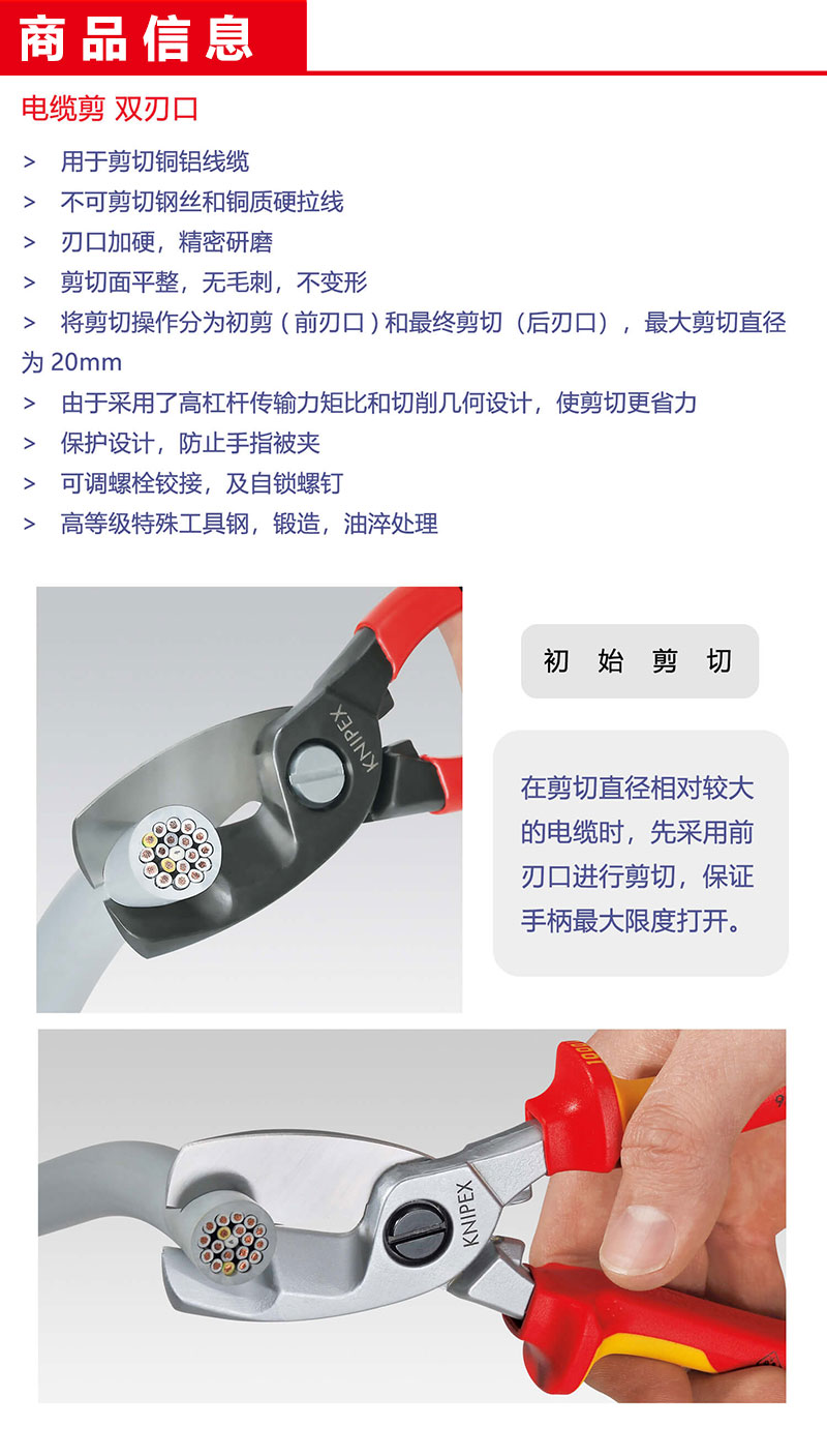 凯尼派克(KNIPEX)95 17 200 绝缘电工电缆剪 镀铬头 浸塑绝缘手柄 1000V 切割类工具 钢